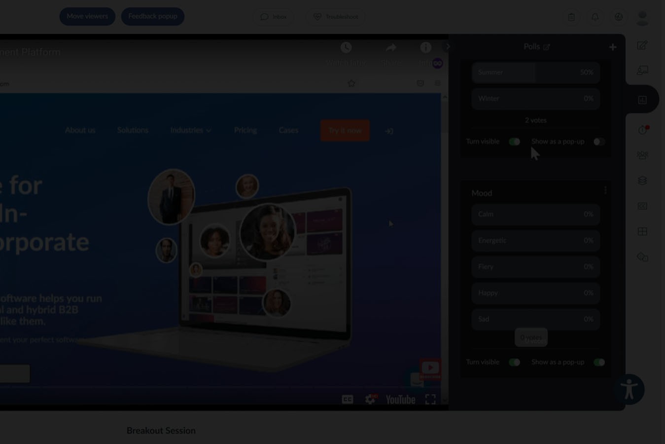 InEvent treats remote participants as first-class attendees, not passive viewers. Chat, questions, and polls all sit in the same interaction layer, regardless of whether someone is in the room or joining remotely.